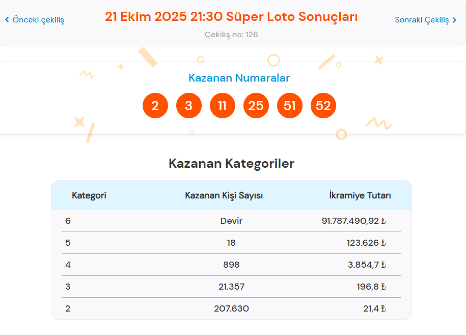 Süper Loto çekiliş sonuçları ve ikramiye sorgulamaları, Milli Piyango Online üzerinden kolayca yapılabilmektedir. Bilet seri numarası ile kazancınızı anında öğrenebilirsiniz. 21 Ekim Süper Loto sonuçları açıklandı, kazananları hemen öğrenmek için tıklayabilirsiniz.