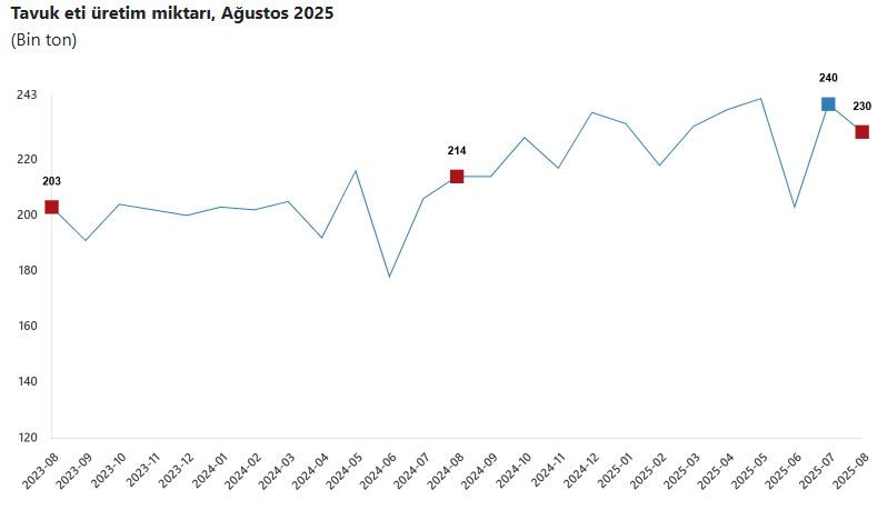Bir önceki ay 239 bin 876 ton olan tavuk eti üretimi Ağustos ayında yüzde 4,1 oranında azalarak 229 bin 965 ton oldu.