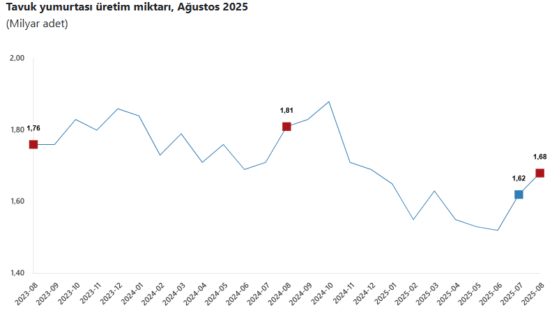 Türkiye İstatistik Kurumu, Ağustos ayı kümes hayvancılığı verilerini açıkladı. Açıklanan verilere göre yumurta üretimi geçen yılın aynı ayına göre yüzde 7,1 azalış gösterdi.
